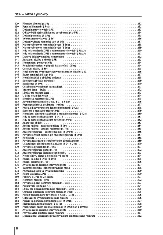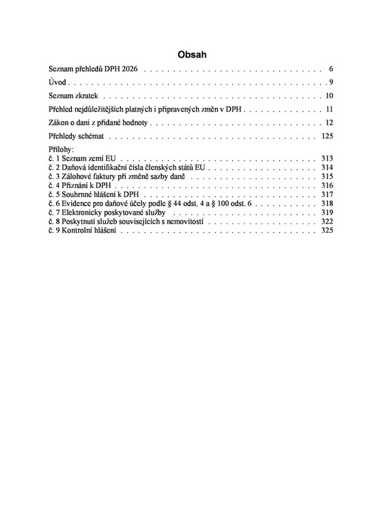V 23. vydání praktické, osvědčené publikace autor na 193 přehledech názorně „zobrazuje“ zákon o DPH ve znění platném k 1. 1. 2026. Tyto přehledy jsou vždy doplněny paragrafy zákona, čímž získáváte neocenitelného pomocníka. Názorné přehledy obsahují např. nová pravidla vrácení daně, podmínky pro vývoz zboží v osobním zavazadle cestujícího, povinnost vrátit odpočet u pohledávek neuhrazených do 6 měsíců po splatnosti, změnu místa plnění u online akcí, režim pro malé podniky, kompletní přehledy druhů a úprav odpočtů, řetězové obchody, podmínky ručení za nezaplacenou daň, podmínky DPH u cestovních služeb, zjednodušený režim „call-offstock“, kdy a jak použít zálohový koeficient, opravy DPH, přenesení daňové povinnosti v tuzemsku, zdanění služeb v EU, poskytnutí služeb z EU a třetích zemí, změny režimu při registraci, vrácení DPH při zrušení registrace a další. V příloze jsou uvedeny formuláře k DPH a seznam elektronicky poskytovaných služeb.