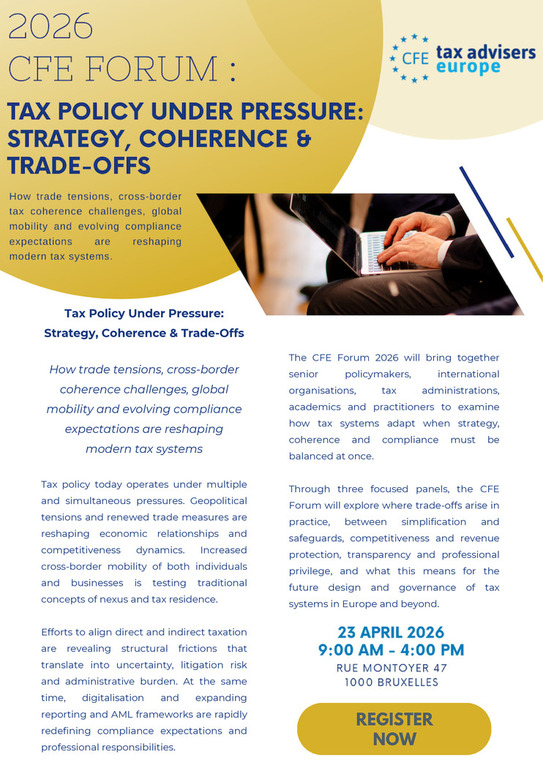 CFE Forum 2026 spojí tvůrce daňových politik, mezinárodní organizace, zástupce daňové správy, akademiky i odborníky z praxe, aby společně analyzovali, jak se daňové systémy přizpůsobují situaci, kdy je nutné současně vyvažovat strategii, soudržnost i compliance. Prostřednictvím tří tematicky zaměřených panelů se fórum bude zabývat tím, kde v praxi vznikají kompromisy – mezi simplifikací a ochrannými opatřeními, konkurenceschopností a zachováním řádného toku daňových příjmů, transparentností a profesní mlčenlivostí – a co to znamená pro budoucí podobu a správu daňových systémů v Evropě i mimo ni.