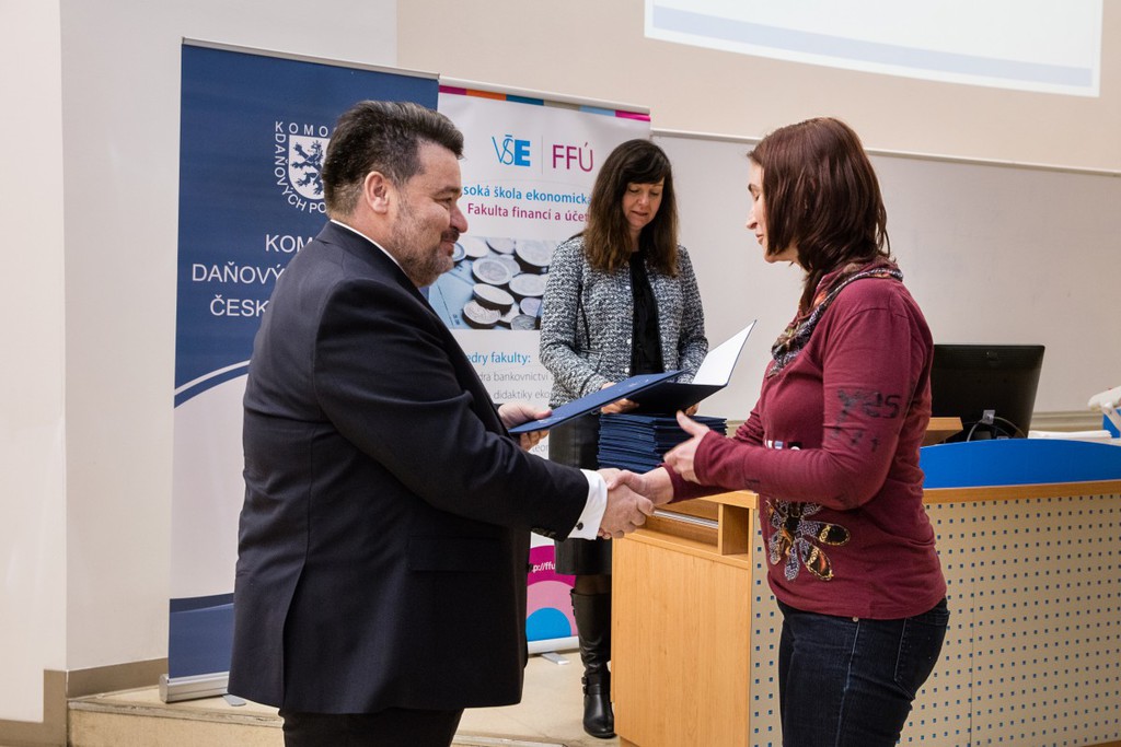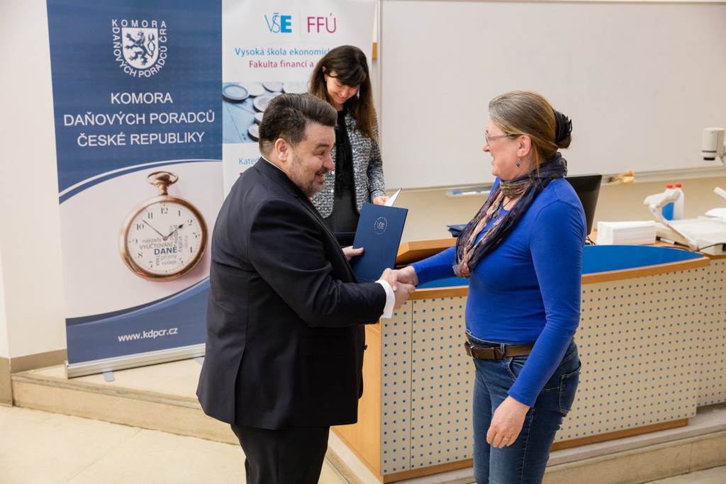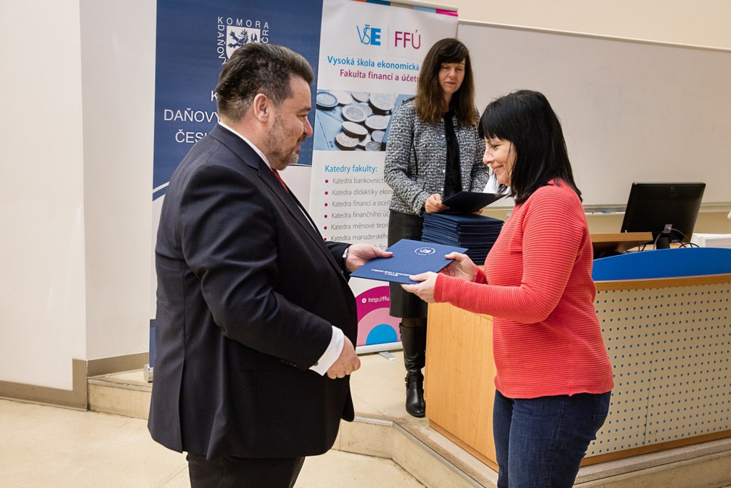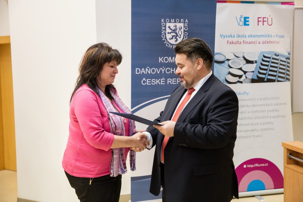 Děkan Fakulty financí a účetnictví VŠE v Praze, doc. Ing. Ladislav Mejzlík, Ph.D., a členka Prezidia KDP ČR, Ing. Jana Skálová, Ph.D., předávali osvědčení absolventům kurzu Účetnictví pro daňové poradenství. Poslední přednáška kurzu a předávání osvědčení proběhlo 10. 3. 2017 v Likešově aule na půdě Vysoké školy ekonomické v Praze. Obsahem tří celodenních přednášek byl koncepční rámec finančního účetnictví, vliv účetnictví na stanovení základů daně z příjmů a judikatura, novela zákona o účetnictví a provázanost účetnictví a daní. Jako přednášející zde vystupovali doc. Ing. Ladislav Mejzlík, Ph.D., Ing. Jiří Pelák, Ph.D., Ing. Jan Molín, Ph.D.