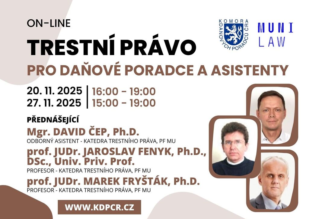 Ve spolupráci s Právnickou fakultou Masarykovy Univerzity jsme pro Vás připravili specializovaný seminář na téma trestní právo se třemi odborníky v této oblasti.
